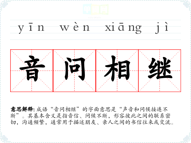成语“音问相继”的字面意思是“声音和问候接连不断”。其基本含义是指音信、问候不断,形容彼此之间的联系密切,沟通频繁,通常用于描述朋友、亲人之间的书信往来或交流。