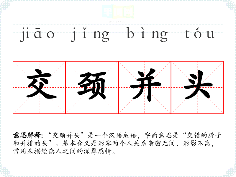 “交颈并头”是一个汉语成语,字面意思是“交错的脖子和并排的头”。基本含义是形容两个人关系亲密无间,形影不离,常用来描绘恋人之间的深厚感情。