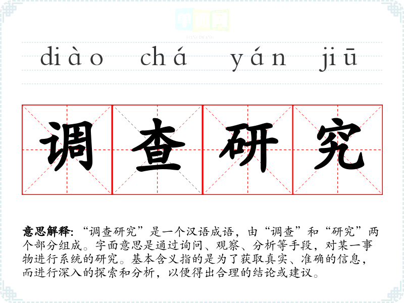 “调查研究”是一个汉语成语,由“调查”和“研究”两个部分组成。字面意思是通过询问、观察、分析等手段,对某一事物进行系统的研究。基本含义指的是为了获取真实、准确的信息,而进行深入的探索和分析,以便得出合理的结论或建议。