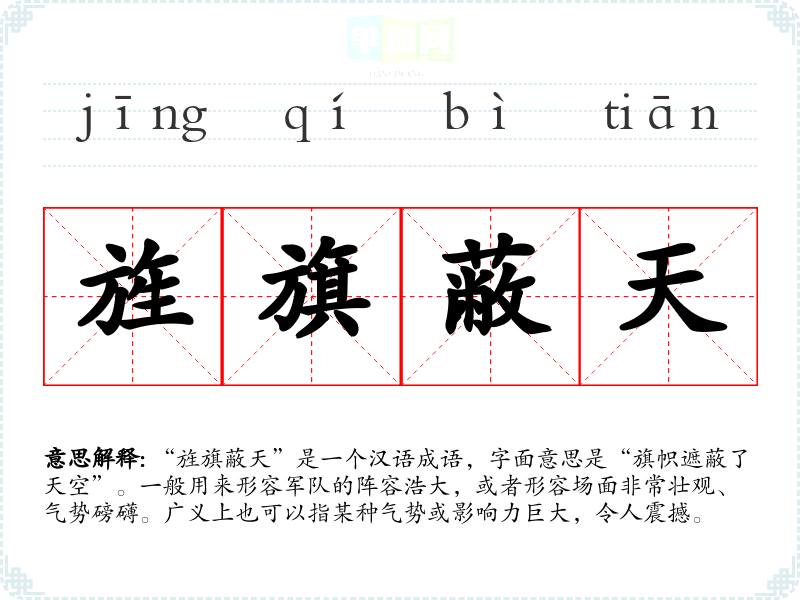 通过对“旌旗蔽天”的学,我认识到成语不仅是语言的表达工具,更是文化的载体。它承载了历史、情感和社会背景,使得语言学不仅是词汇的积累,也是文化的深入理解。这个成语在日常交流中可以用来增强表达的生动性,帮助我们更好地传达情感与气势。