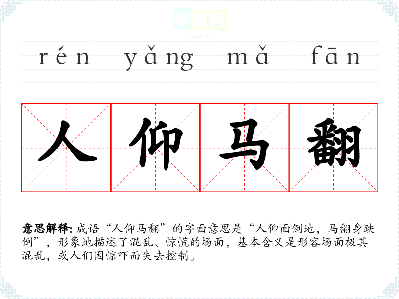 成语“人仰马翻”的字面意思是“人仰面倒地,马翻身跌倒”,形象地描述了混乱、惊慌的场面,基本含义是形容场面极其混乱,或人们因惊吓而失去控制。