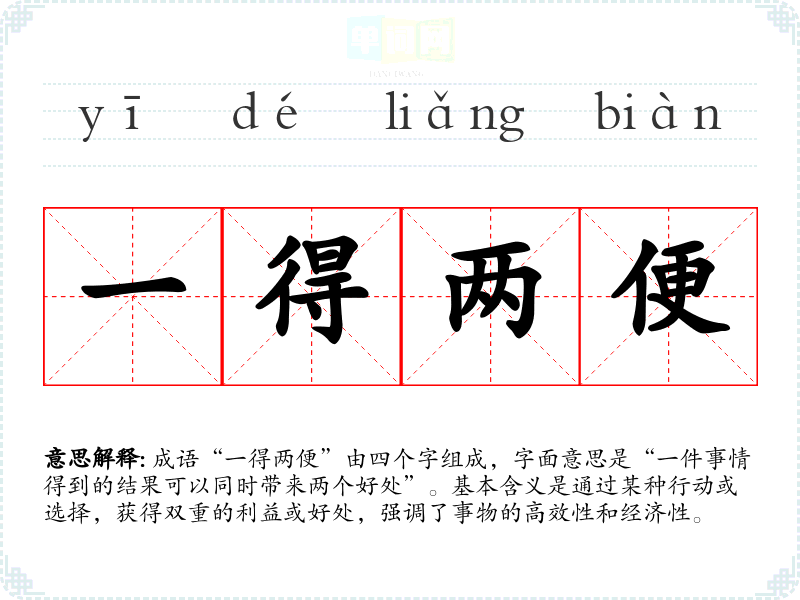 成语“一得两便”由四个字组成,字面意思是“一件事情得到的结果可以同时带来两个好处”。基本含义是通过某种行动或选择,获得双重的利益或好处,强调了事物的高效性和经济性。