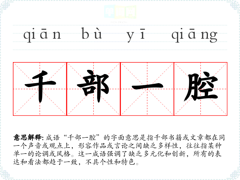 成语“千部一腔”的字面意思是指千部书籍或文章都在同一个声音或观点上,形容作品或言论之间缺乏多样性,往往指某种单一的论调或风格。这一成语强调了缺乏多元化和创新,所有的表达和看法都趋于一致,不具个性和特色。