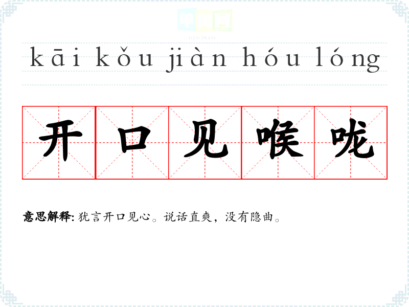 | 开口见喉咙 | 犹言开口见心。说话直爽,没有隐曲。 |