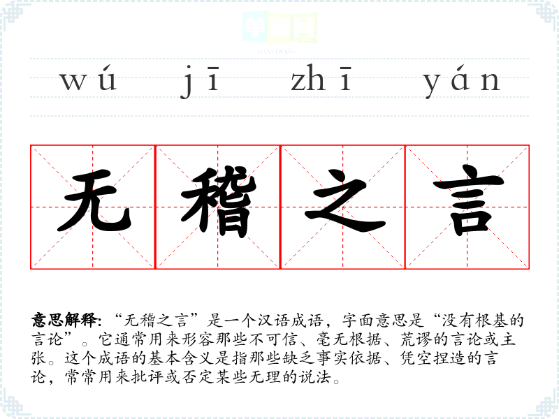 | 无稽之言 | 没有根据、无从查证的话。 |