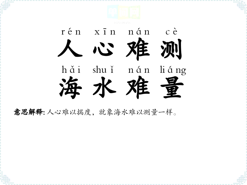 | 人心难测,海水难量 | 人心难以揣度,就象海水难以测量一样。 |