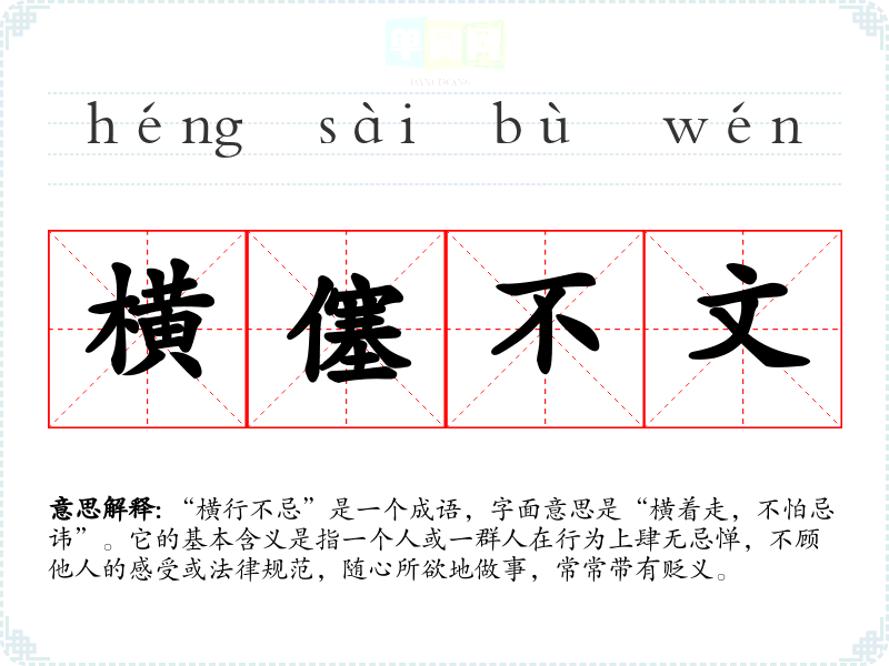 在**传统文化中,横行不忌的行为往往受到社会的强烈反对,尤其是在强调道德与伦理的背景下。现代社会中,这个成语依然适用于描述那些不遵循社会规范、法律法规的人,提醒人们要保持警惕。