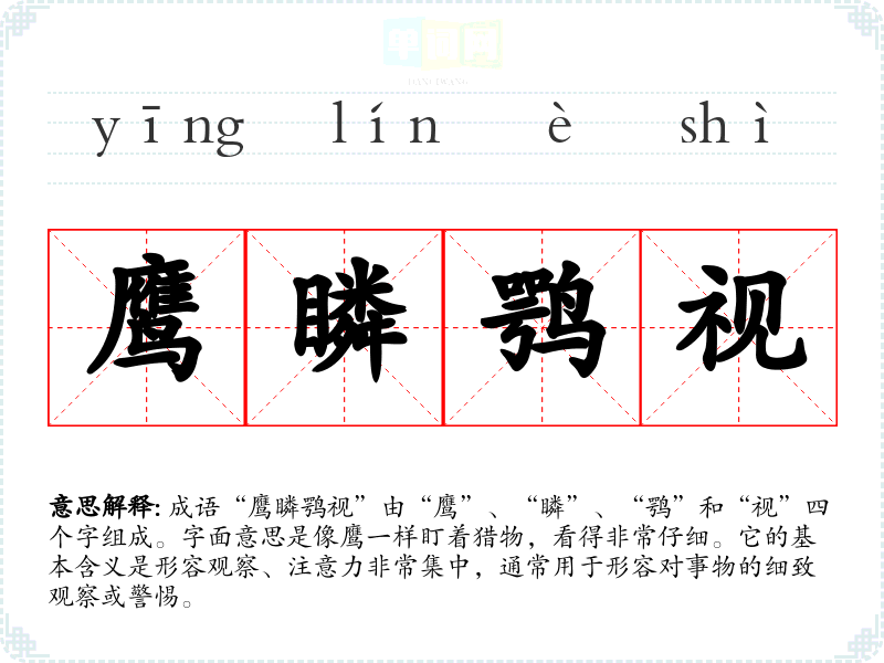成语“鹰瞵鹗视”由“鹰”、“瞵”、“鹗”和“视”四个字组成。字面意思是像鹰一样盯着猎物,看得非常仔细。它的基本含义是形容观察、注意力非常集中,通常用于形容对事物的细致观察或警惕。