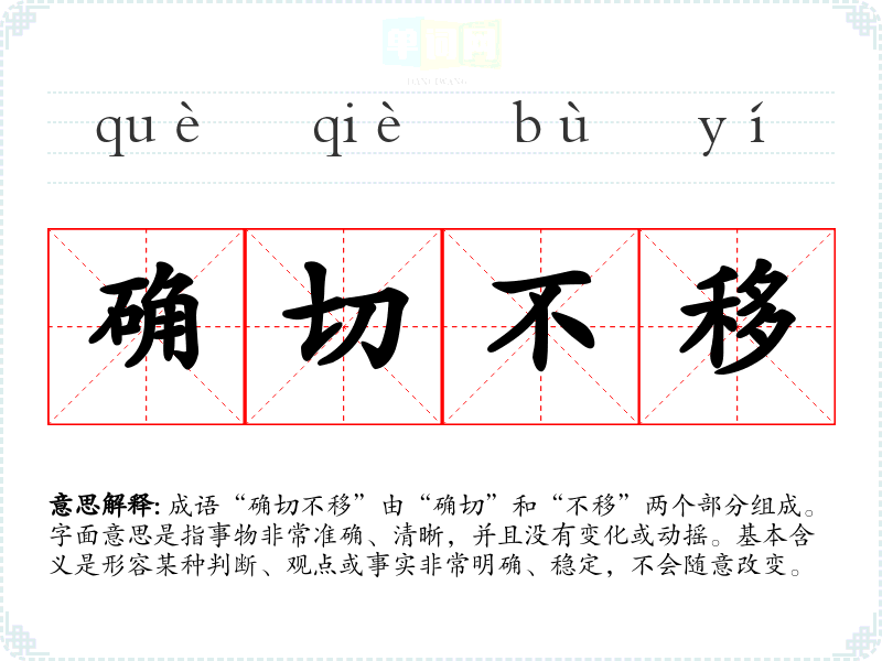 成语“确切不移”由“确切”和“不移”两个部分组成。字面意思是指事物非常准确、清晰,并且没有变化或动摇。基本含义是形容某种判断、观点或事实非常明确、稳定,不会随意改变。