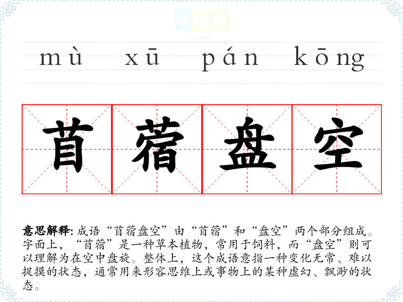 成语“苜蓿盘空”由“苜蓿”和“盘空”两个部分组成。字面上,“苜蓿”是一种草本植物,常用于饲料,而“盘空”则可以理解为在空中盘旋。整体上,这个成语意指一种变化无常、难以捉摸的状态,通常用来形容思维上或事物上的某种虚幻、飘渺的状态。
