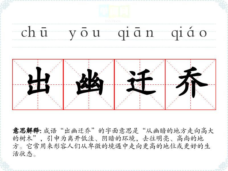 成语“出幽迁乔”的字面意思是“从幽暗的地方走向高大的树木”,引申为离开低洼、阴暗的环境,去往明亮、高尚的地方。它常用来形容人们从卑微的境遇中走向更高的地位或更好的生活状态。