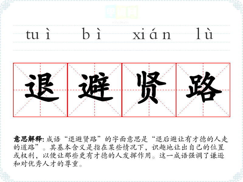 成语“退避贤路”的字面意思是“退后避让有才德的人走的道路”。其基本含义是指在某些情况下,识趣地让出自己的位置或权利,以便让那些更有才德的人发挥作用。这一成语强调了谦逊和对优秀人才的尊重。