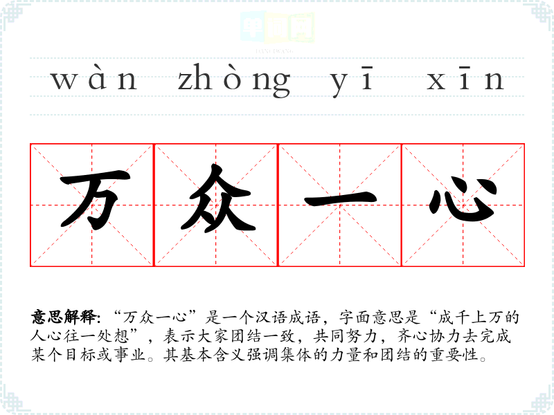 “万众一心”是一个汉语成语,字面意思是“成千上万的人心往一处想”,表示大家团结一致,共同努力,齐心协力去完成某个目标或事业。其基本含义强调集体的力量和团结的重要性。