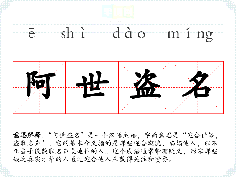 “阿世盗名”是一个汉语成语,字面意思是“迎合世俗,盗取名声”。它的基本含义指的是那些迎合潮流、谄媚他人,以不正当手段获取名声或地位的人。这个成语通常带有贬义,形容那些缺乏真实才华的人通过迎合他人来获得关注和赞誉。