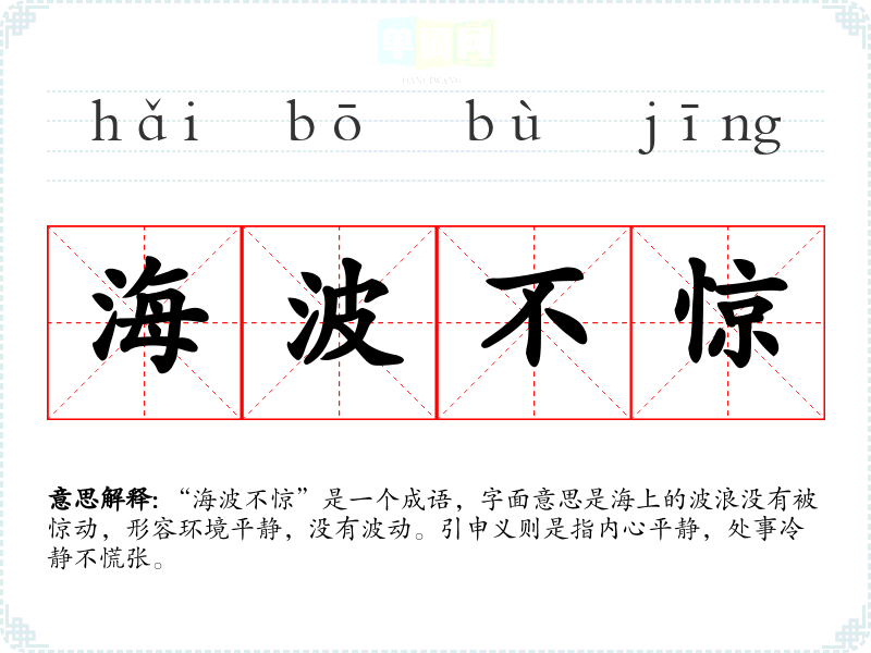 “海波不惊”是一个成语,字面意思是海上的波浪没有被惊动,形容环境平静,没有波动。引申义则是指内心平静,处事冷静不慌张。