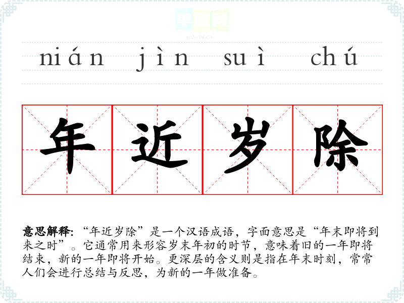 “年近岁除”是一个汉语成语,字面意思是“年末即将到来之时”。它通常用来形容岁末年初的时节,意味着旧的一年即将结束,新的一年即将开始。更深层的含义则是指在年末时刻,常常人们会进行总结与反思,为新的一年做准备。