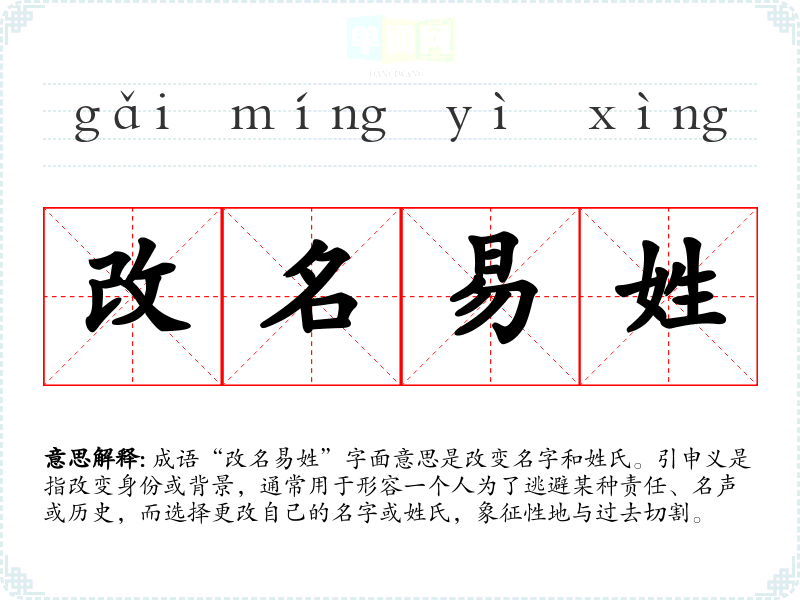 成语“改名易姓”字面意思是改变名字和姓氏。引申义是指改变身份或背景,通常用于形容一个人为了逃避某种责任、名声或历史,而选择更改自己的名字或姓氏,象征性地与过去切割。