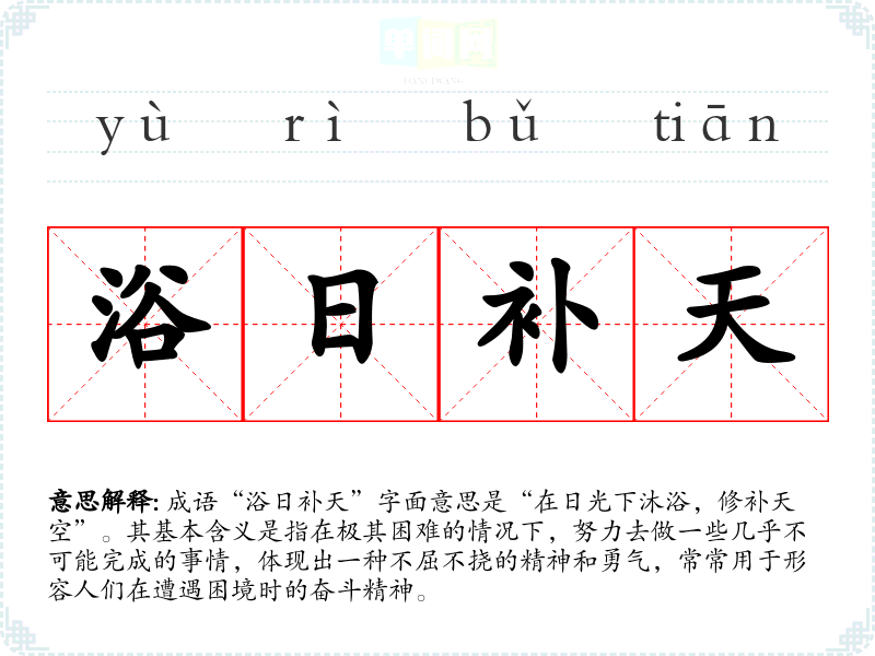 成语“浴日补天”字面意思是“在日光下沐浴,修补天空”。其基本含义是指在极其困难的情况下,努力去做一些几乎不可能完成的事情,体现出一种不屈不挠的精神和勇气,常常用于形容人们在遭遇困境时的奋斗精神。