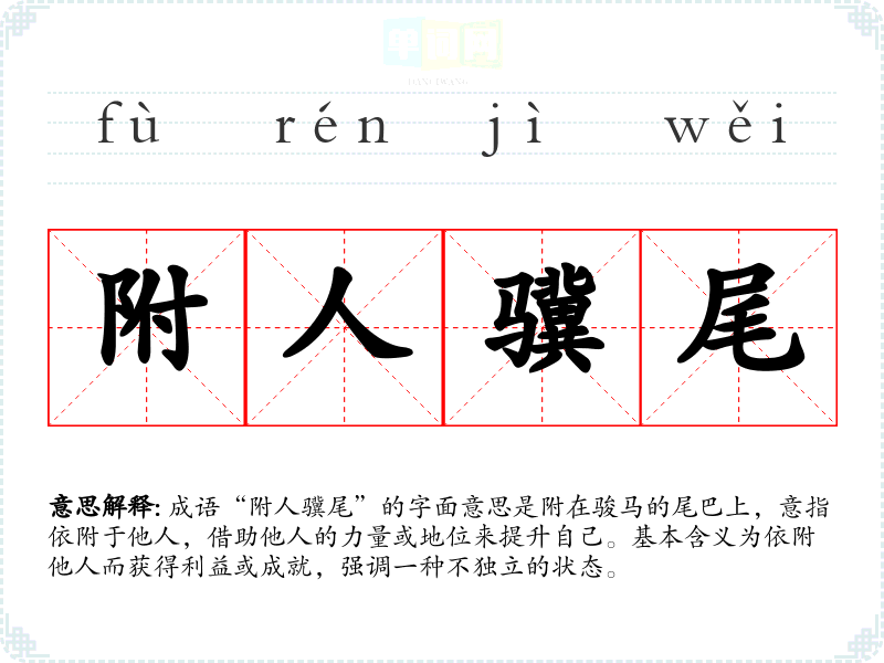 “附人骥尾”常用于描述那些依附于他人的人,特别是在文学作品、政治演讲、职场交流等场合中。它可以用来批评那些缺乏独立性或能力的人,也可以用于自我反思,提醒自己不要过于依赖他人。