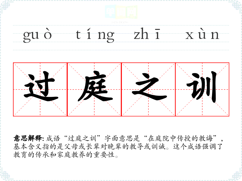 成语“过庭之训”字面意思是“在庭院中传授的教诲”,基本含义指的是父母或长辈对晚辈的教导或训诫。这个成语强调了教育的传承和家庭教养的重要性。