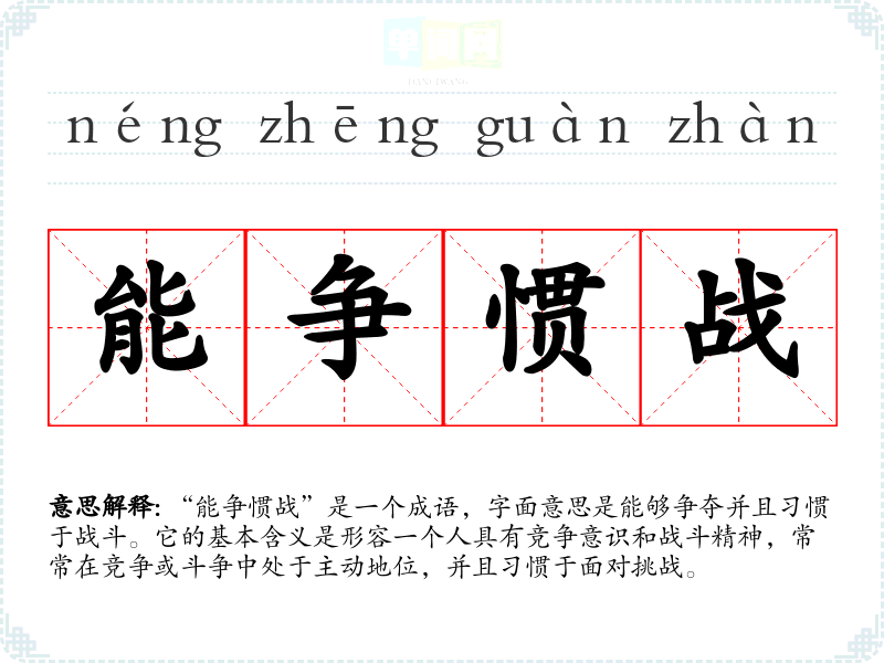 “能争惯战”是一个成语,字面意思是能够争夺并且惯于战斗。它的基本含义是形容一个人具有竞争意识和战斗精神,常常在竞争或斗争中处于主动地位,并且惯于面对挑战。