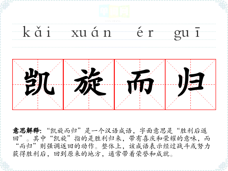 “凯旋而归”是一个汉语成语,字面意思是“胜利后返回”。其中“凯旋”指的是胜利归来,带有喜庆和荣耀的意味,而“而归”则强调返回的动作。整体上,该成语表示经过战斗或努力获得胜利后,回到原来的地方,通常带着荣誉和成就。