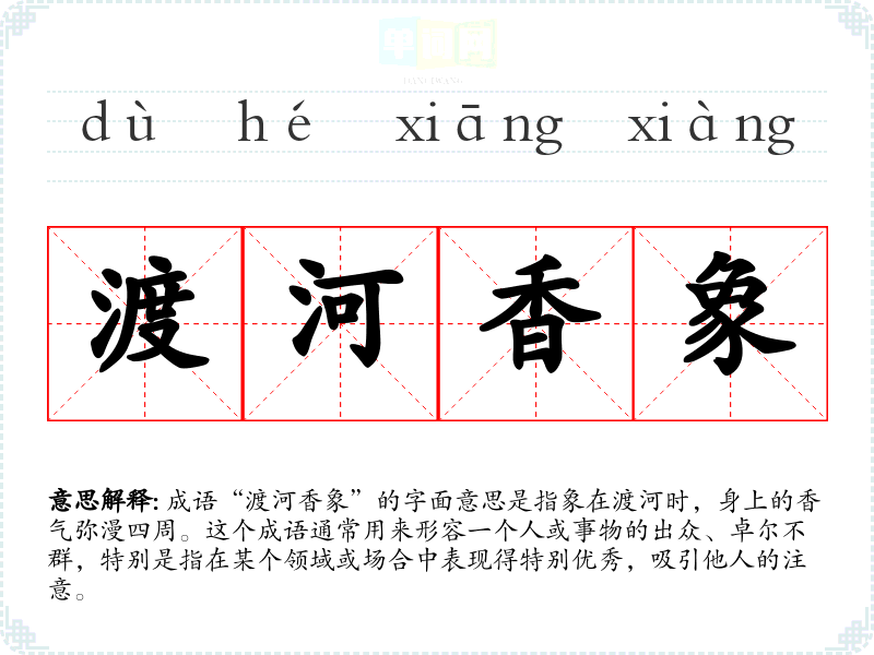 成语“渡河香象”的字面意思是指象在渡河时,身上的香气弥漫四周。这个成语通常用来形容一个人或事物的出众、卓尔不群,特别是指在某个领域或场合中表现得特别优秀,吸引他人的注意。