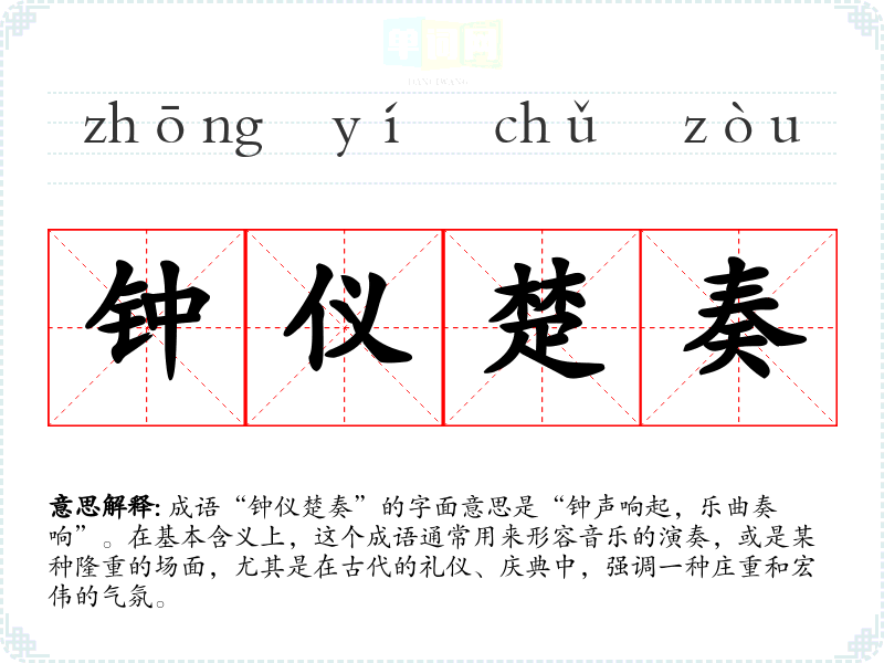 成语“钟仪楚奏”的字面意思是“钟声响起,乐曲奏响”。在基本含义上,这个成语通常用来形容音乐的演奏,或是某种隆重的场面,尤其是在古代的礼仪、庆典中,强调一种庄重和宏伟的气氛。