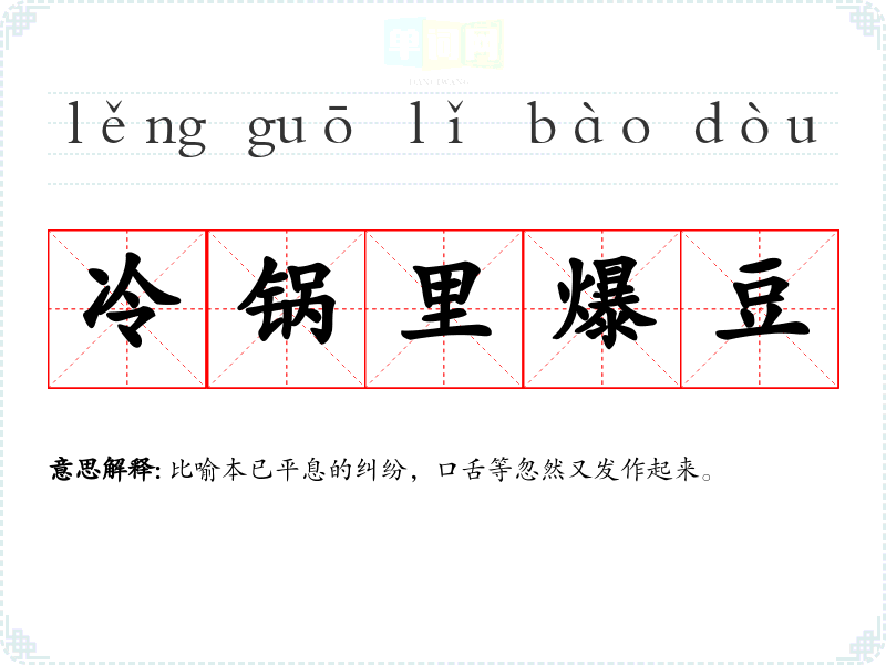 | 冷锅里爆豆 | 比喻本已平息的纠纷,口舌等忽然又发作起来。 |