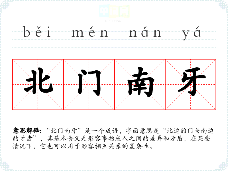 “北门南牙”是一个成语,字面意思是“北边的门与南边的牙齿”,其基本含义是形容事物或人之间的差异和矛盾。在某些情况下,它也可以用于形容相互关系的复杂性。