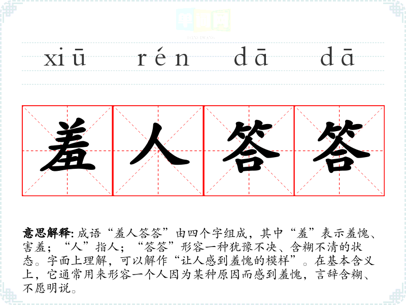 成语“羞人答答”由四个字组成,其中“羞”表示羞愧、害羞;“人”指人;“答答”形容一种犹豫不决、含糊不清的状态。字面上理解,可以解作“让人感到羞愧的模样”。在基本含义上,它通常用来形容一个人因为某种原因而感到羞愧,言辞含糊、不愿明说。