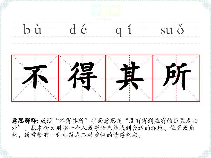 成语“不得其所”字面意思是“没有得到应有的位置或去处”。基本含义则指一个人或事物未能找到合适的环境、位置或角色,通常带有一种失落或不被重视的情感色彩。