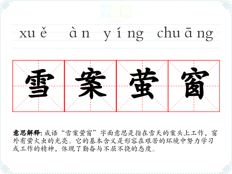 成语“雪案萤窗”字面意思是指在雪天的案头上工作,窗外有萤火虫的光亮。它的基本含义是形容在艰苦的环境中努力学*或工作的精神,体现了勤奋与不屈不挠的态度。