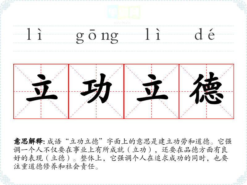 成语“立功立德”字面上的意思是建立功劳和道德。它强调一个人不仅要在事业上有所成就(立功),还要在品德方面有良好的表现(立德)。整体上,它强调个人在追求成功的同时,也要注重道德修养和社会责任。