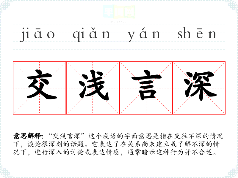 “交浅言深”这个成语的字面意思是指在交往不深的情况下,谈论很深刻的话题。它表达了在关系尚未建立或了解不深的情况下,进行深入的讨论或表达情感,通常暗示这种行为并不合适。