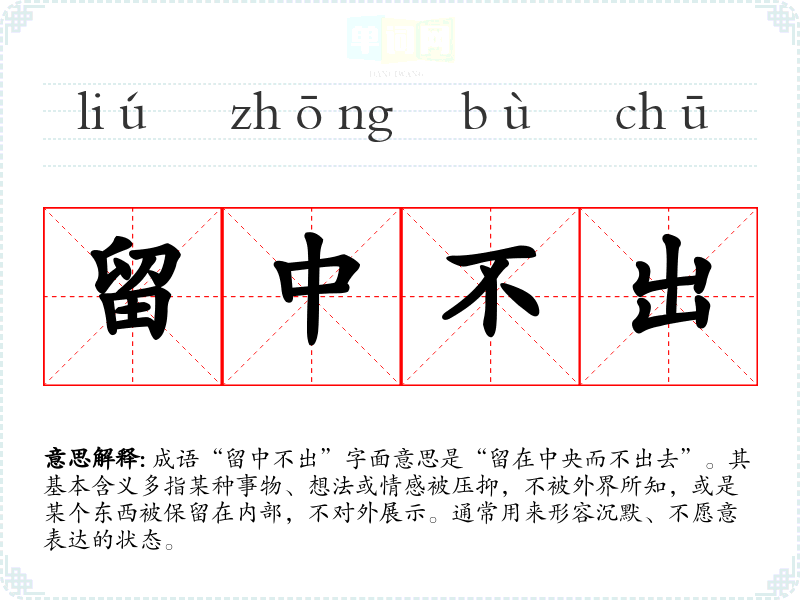 成语“留中不出”字面意思是“留在中央而不出去”。其基本含义多指某种事物、想法或情感被压抑,不被外界所知,或是某个东西被保留在内部,不对外展示。通常用来形容沉默、不愿意表达的状态。