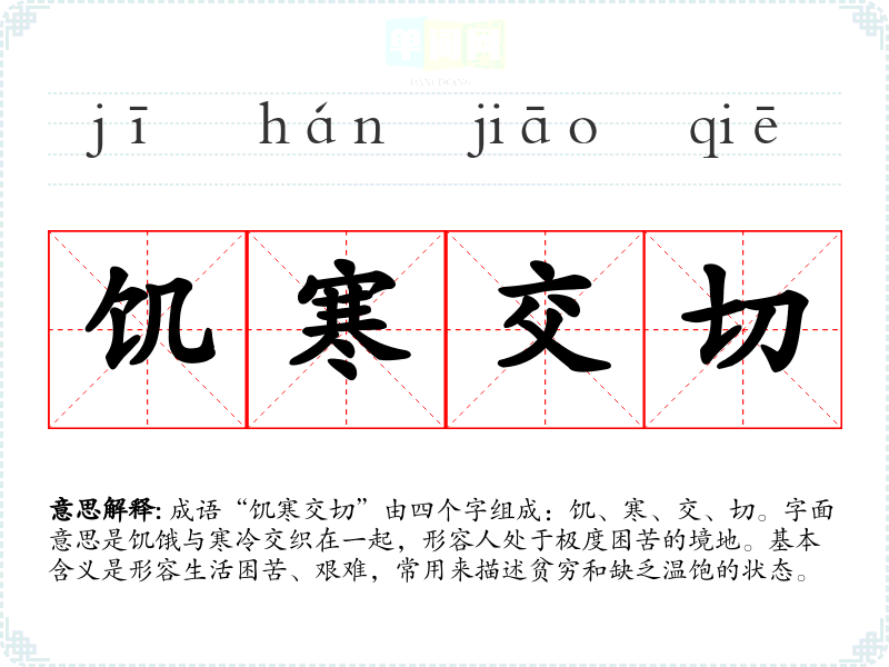 | 饥寒交切 | 饥饿与寒冷一齐逼来。形容无衣无食,生活极其贫困。 |