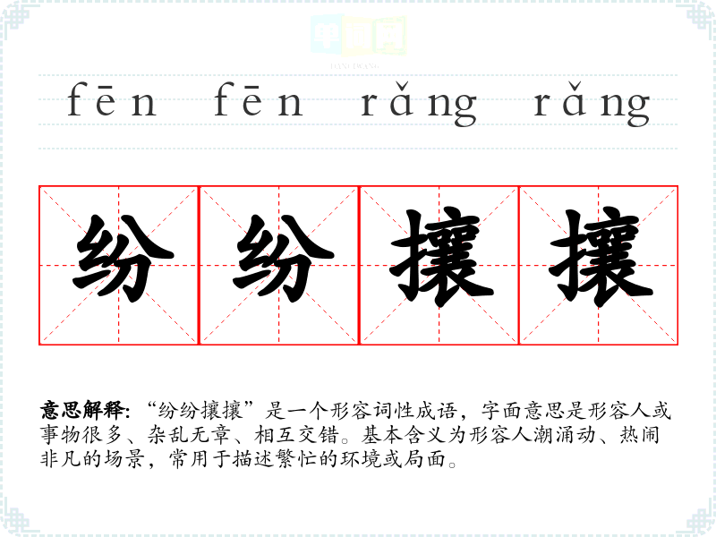 “纷纷攘攘”是一个形容词性成语,字面意思是形容人或事物很多、杂乱无章、相互交错。基本含义为形容人潮涌动、热闹非凡的场景,常用于描述繁忙的环境或局面。