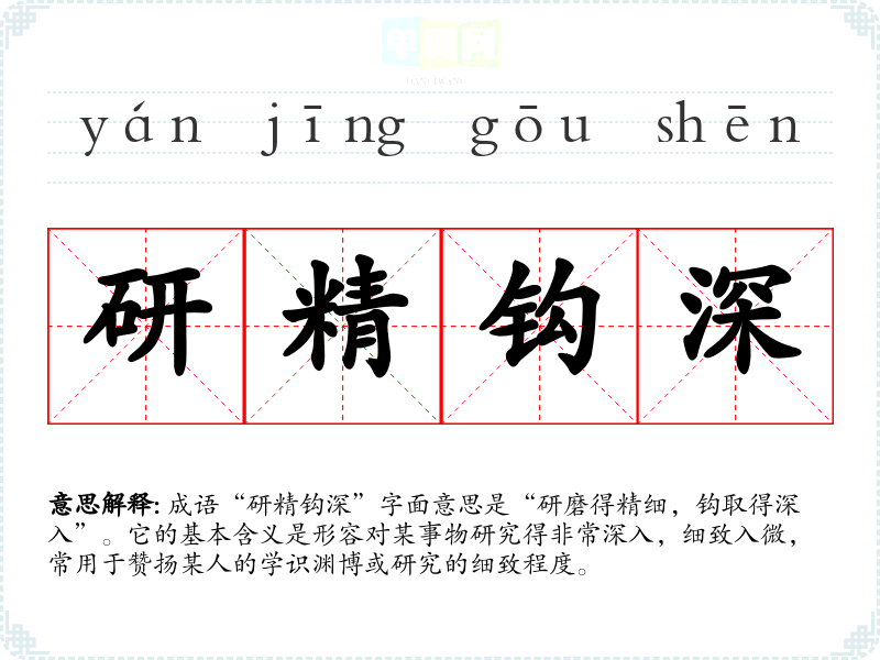 成语“研精钩深”字面意思是“研磨得精细,钩取得深入”。它的基本含义是形容对某事物研究得非常深入,细致入微,常用于赞扬某人的学识渊博或研究的细致程度。