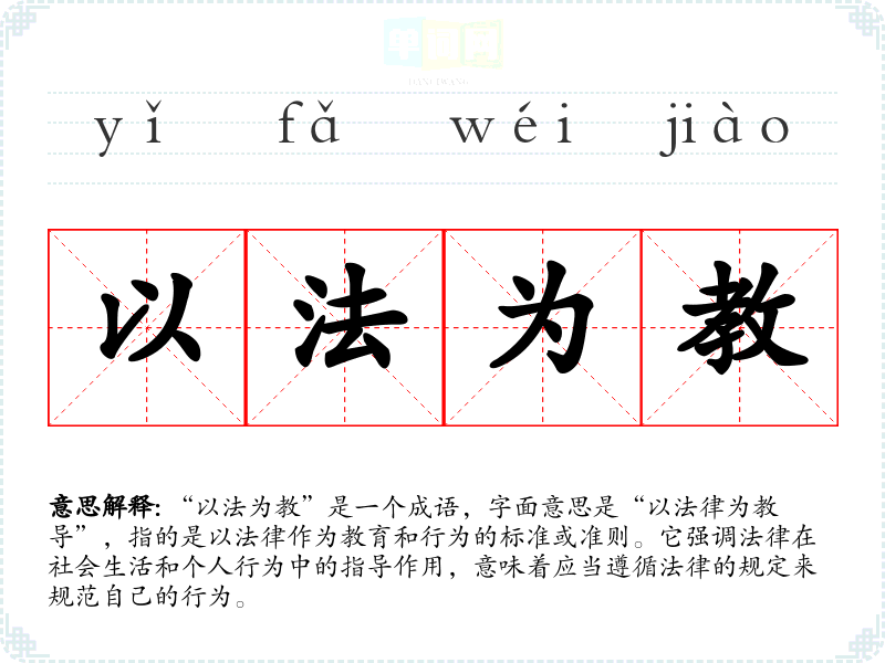 “以法为教”是一个成语,字面意思是“以法律为教导”,指的是以法律作为教育和行为的标准或准则。它强调法律在社会生活和个人行为中的指导作用,意味着应当遵循法律的规定来规范自己的行为。
