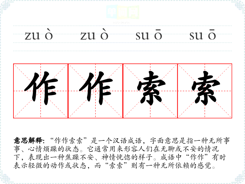 “作作索索”是一个汉语成语,字面意思是指一种无所事事、心情烦躁的状态。它通常用来形容人们在无聊或不安的情况下,表现出一种焦躁不安、神情恍惚的样子。成语中“作作”有时表示轻微的动作或状态,而“索索”则有一种无所依赖的感觉。