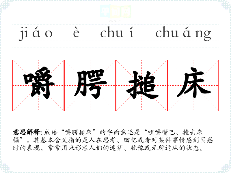 成语“嚼腭搥床”的字面意思是“咀嚼嘴巴、撞击床榻”。其基本含义指的是人在思考、回忆或者对某件事情感到困惑时的表现,常常用来形容人们的迷茫、犹豫或无所适从的状态。