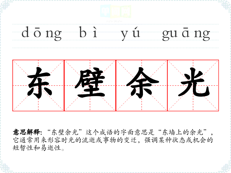 “东壁余光”这个成语的字面意思是“东墙上的余光”,它通常用来形容时光的流逝或事物的变迁,强调某种状态或机会的短暂性和易逝性。