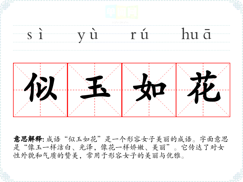 成语“似玉如花”是一个形容女子美丽的成语。字面意思是“像玉一样洁白、光泽,像花一样娇嫩、美丽”。它传达了对女性外貌和气质的赞美,常用于形容女子的美丽与优雅。