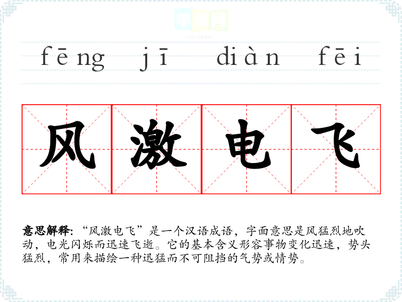 通过对“风激电飞”的学,我感受到它不仅仅是一个成语,更是一种情感的共鸣与文化的传承。在语言学中,理解成语的深层含义和使用场景,有助于提高表达的丰富性和准确性。这种成语的运用能够使沟通更具表现力,增强语言的感染力。
