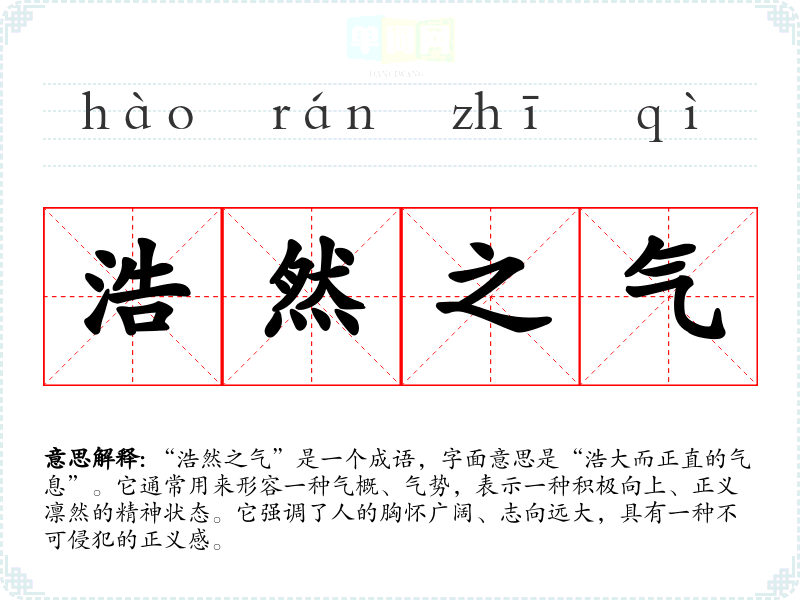 “浩然之气”是一个成语,字面意思是“浩大而正直的气息”。它通常用来形容一种气概、气势,表示一种积极向上、正义凛然的精神状态。它强调了人的胸怀广阔、志向远大,具有一种不可侵犯的正义感。