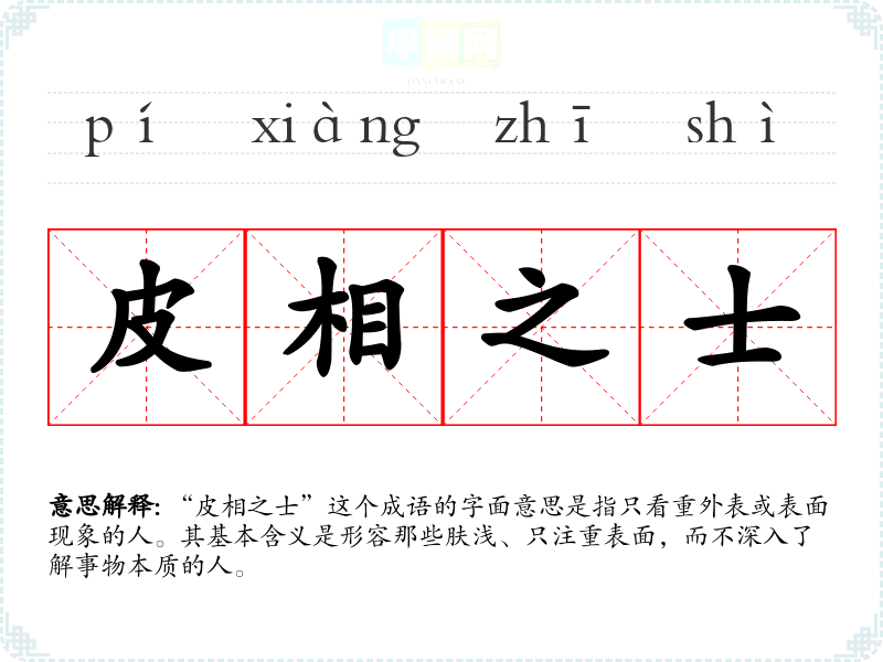 “皮相之士”这个成语的字面意思是指只看重外表或表面现象的人。其基本含义是形容那些肤浅、只注重表面,而不深入了解事物本质的人。
