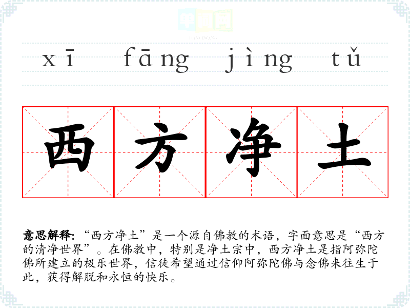 | 西方净土 | 佛教语。西方之极乐世界,即佛国。 |