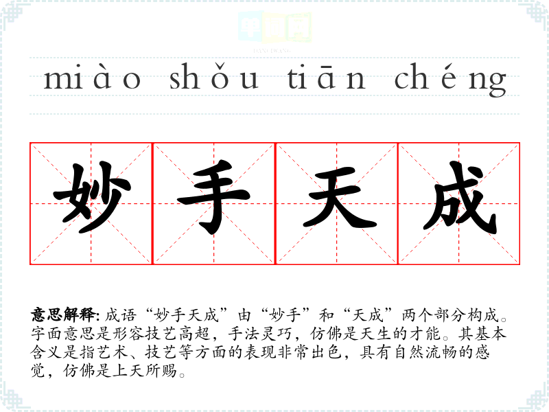 成语“妙手天成”由“妙手”和“天成”两个部分构成。字面意思是形容技艺高超,手法灵巧,仿佛是天生的才能。其基本含义是指艺术、技艺等方面的表现非常出色,具有自然流畅的感觉,仿佛是上天所赐。
