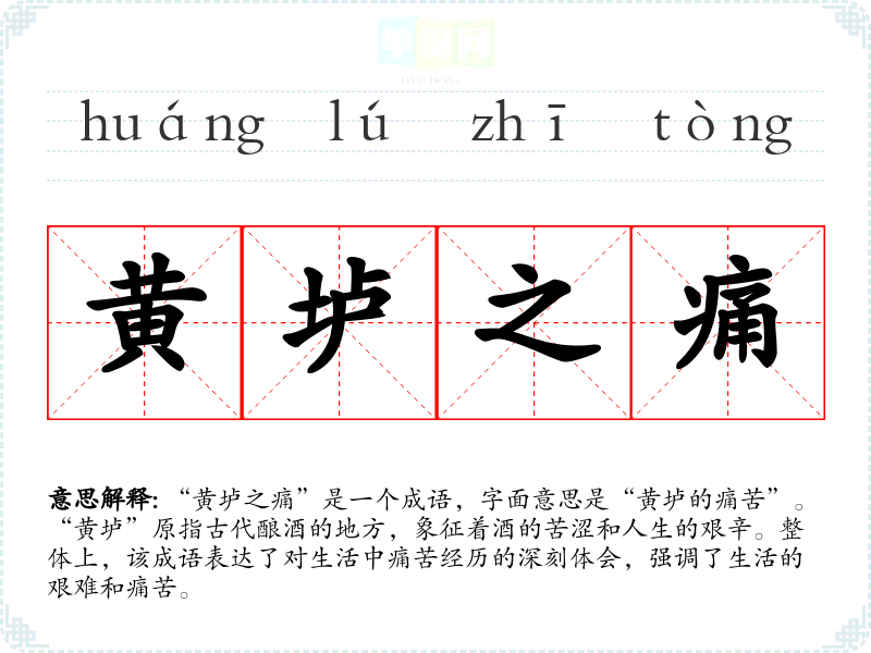 “黄垆之痛”是一个成语,字面意思是“黄垆的痛苦”。“黄垆”原指古代酿酒的地方,象征着酒的苦涩和人生的艰辛。整体上,该成语表达了对生活中痛苦经历的深刻体会,强调了生活的艰难和痛苦。